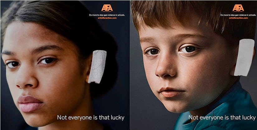 Dead simple. Young kids, wearing an ear bandage just like Donald Trump and lots of strange folk at his rallies. Killer strapline. Literally and metaphorically.